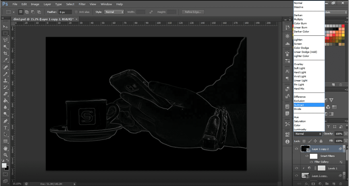 Sekarang pilih blending modenya menjadi subtract. Sama seperti cutout 2, buat new fill levels. Atur kembali levels sesuai keinginanmu