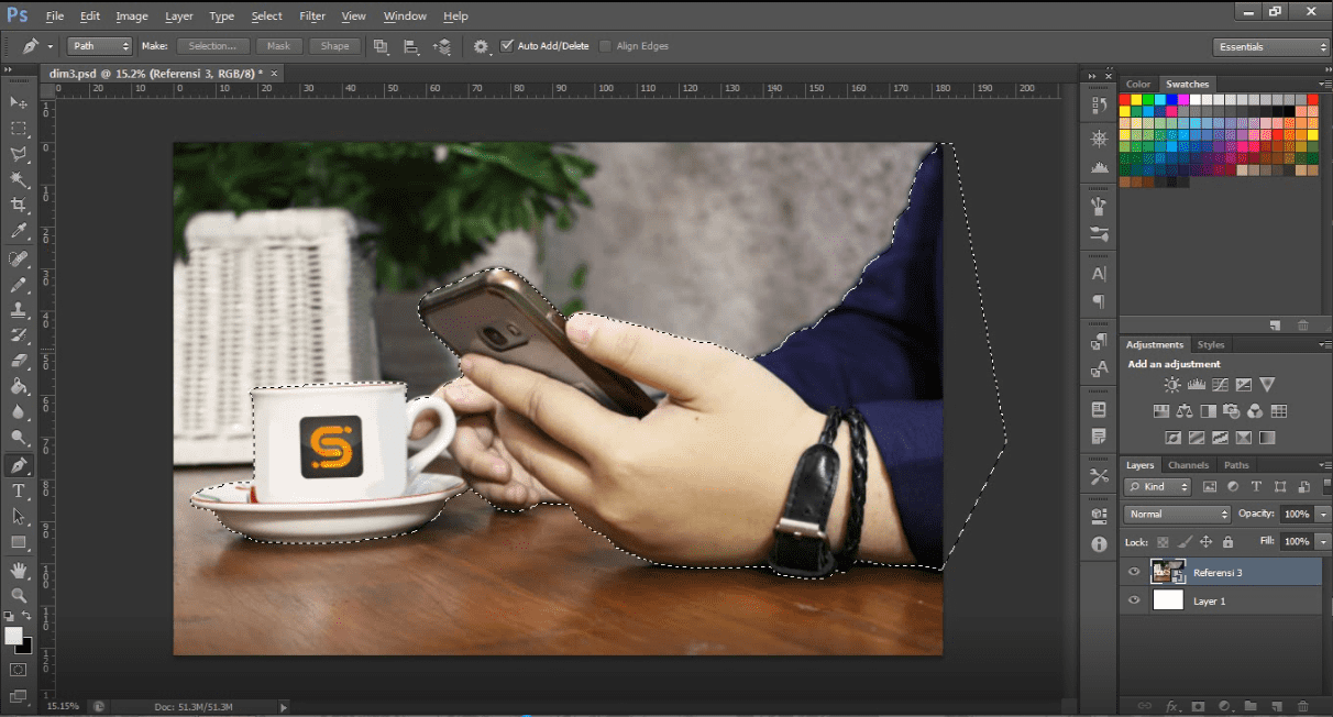 Pertama, kita select terlebih dahulu bagian yang mau kita rubah. Bisa pakai pen tool ataupun lasso tool.
