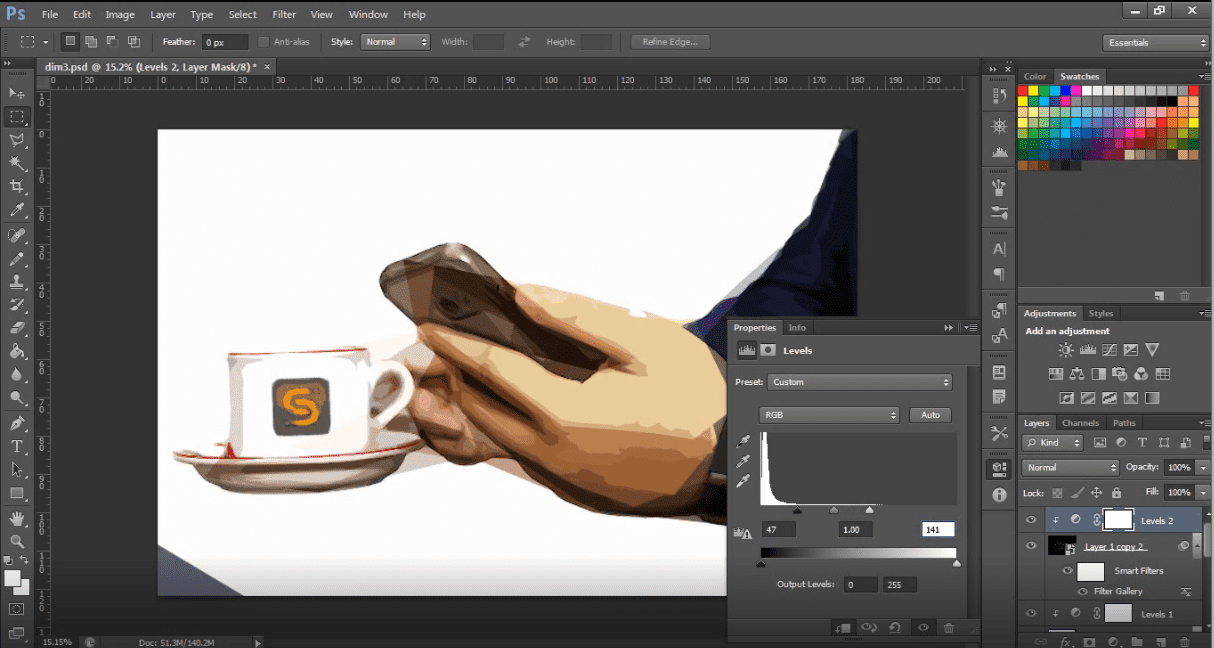pada kolom levels agar efek dari level hanya untuk 1 layer dibawahnyaAtur levels agar gambar menjadi lebih cerah. Kamu bisa bereksperimen untuk menemukan settingan yang pas
